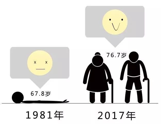 居民预期寿命由1981年的67.8岁提高到2017年的 76.7岁 !