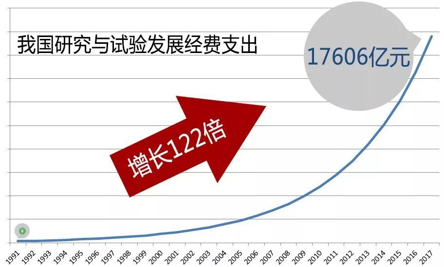 2017年,我国研究与试验发展经费支出 17606亿元 ,比1991年增长 122倍 ,年均增长20.3%。
