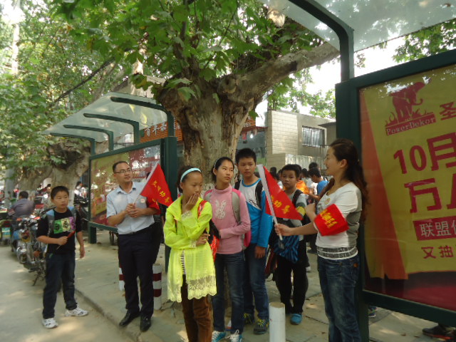 每天学生放学后,我校志愿者在校门口公交车站劝导
