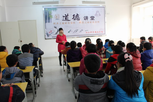 为弘扬中华民族优良传统美德,培养学生高尚的道德情操, 12 月 13 日,我校朝阳分校开展“道德讲堂”活动。在课堂上,讲解员沈同昕老师结合现实生活,运用生动的事例深入浅出地宣讲了道德的含义以及我国古往今来的道德规范,沈老师的讲解使学生们深受教育。随后,在多媒体教室学生们纷纷走上讲台和同学们分享他们的道德故事。此次活动取得了良好的效果。朝阳分校的“道德讲堂”活动,是学校不断推进校园道德文化建设的重要措施之一,朝阳分校将坚持把这项活动开展下去,让道德意识深入人心,人人懂道德,人人讲道德、人人守道德,把朝阳分校建设成文明、和谐、道德风气浓厚的典范学校。