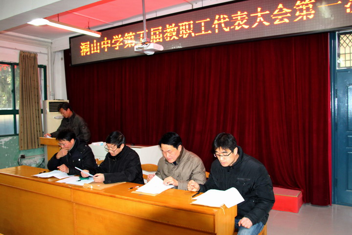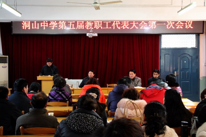 我校注重民主建设,加强民主管理,制定了教职工代表大会制度, 让教职工为学校的建设发展献计献策。2014新的一年, 全校教师推选了 新一届职工代表。 1月23日上午, 第五届职工代表大会第一次会议隆重召开。大会由刘宗保校长主持,校办公室 周平主任作《洞山中学工会工作报告》和大会筹备情况的报告,李跃来副校长作《洞山中学行政工作报告》,王洪军副校长作《洞山中学账务工作报告》,张跃华校长作《职代会 提案解答报告》,徐永忠书记 做大会总结报告并致闭幕辞。