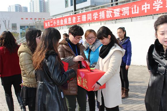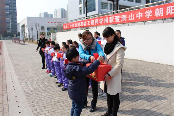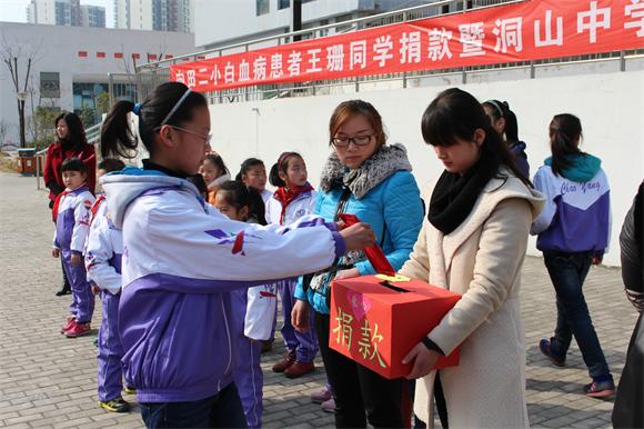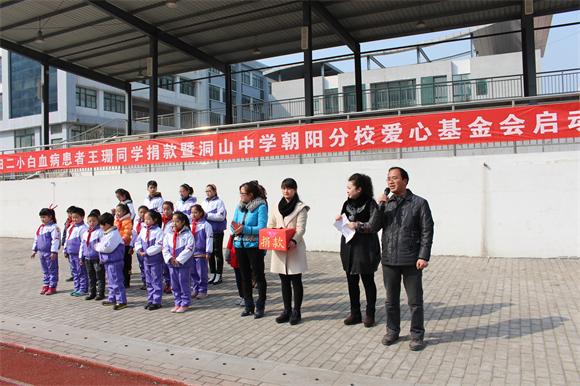 校园有情,大爱无疆, 田二小王珊同学 身患白血病, 牵动了我校朝阳分校每一个师生的 心。 3 月 10 上午,我校 举行 “向田二小患病学生王珊捐款暨爱心基金会成立”仪式。仪式上, 老师 们身先士卒,带头捐款 ,同学们 纷纷拿出自己的零花钱,有的 家长还 和孩子一起捐款。 爱心传递,暖流涌动,在随后 短短三天 内,我校共募集捐款 18039 元 。我们相信,这些蕴含着至爱之情 的捐款将化成一缕缕阳光,汇成一股股甘泉,让干枯的生命之花重新绽放! 我们衷心祝愿王珊同学早日战胜病魔,恢复健康,重返校园。