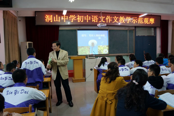 3 月 25 、 26 日, 我校中小学开展语文作文教学教研活动。 25 日下午,中学语文作文教学示范观摩课开讲,拉开了我校本周教研活动的序幕。为加强交流,我校邀请了淮南市“名师工作室”的吴如厂老师前来授课。吴老师在课堂上与学生互动,当堂交流,帮助学生挖掘生活素材,针对初三学生写作现状,吴老师用写作实例启发学生写作思路,点拨写作方法,给了学生们有益的指导。随后,我校童大信老师讲授了一堂作文教学课。童老师主要针对学生写作中的薄弱环节重点讲解了文章中的描写方法。两位老师以各自教学实践所积淀的丰厚经验给学生们传达了丰富的写作信息,与听课老师进行交流。本次作文教学示范观摩,市教研室语文教研员彭光品老师、市教师进修学校教务科黄良春科长、区教研室宋应开主任也莅临指导,兄弟学校和本校语文教师约 60 余人前来观摩。