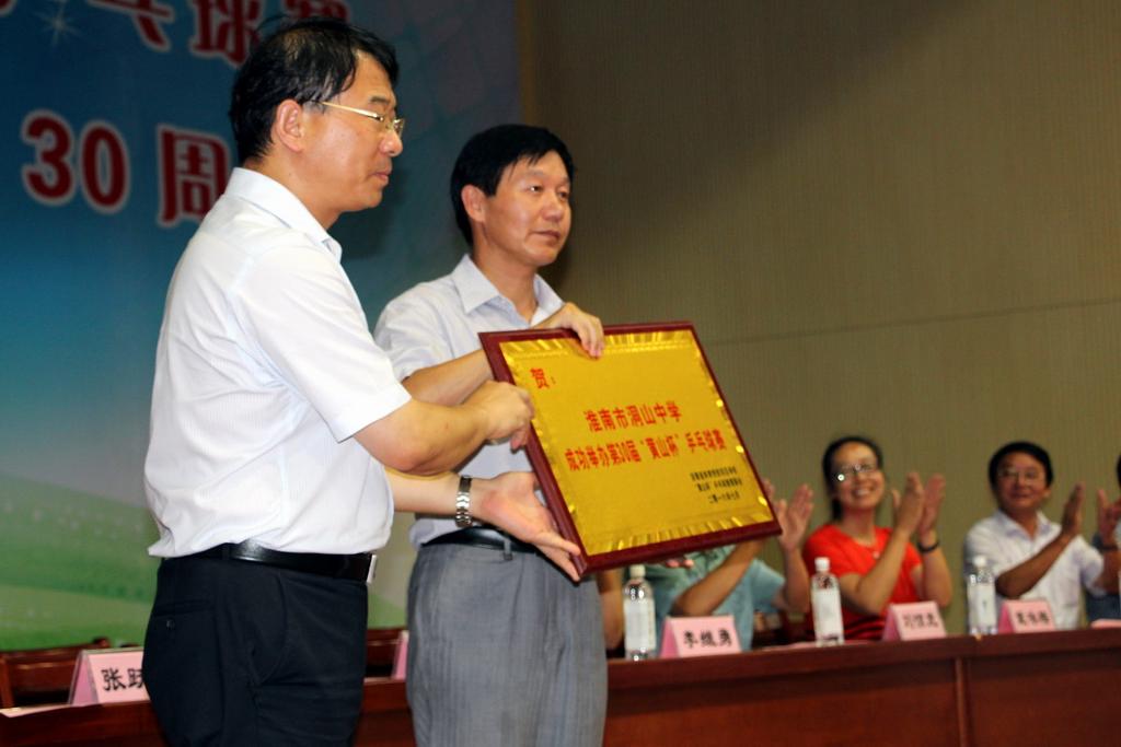 在下午的闭幕式上,省“黄山杯”赛理事会副秘书长、总裁判左其严璞首先宣布比赛成绩;理事会副秘书长汤其林宣布道德风尚奖获奖单位名单;理事会副理事长刘惊虎致闭幕词。随后,理事会向承办此次比赛的我校赠送牌匾,组委会宣布下一届“黄山杯”赛承办单位,并举行会旗交接仪式。最后,理事会领导及承办校我校领导为获奖单位和个人颁奖;组委会宣布本届“黄山杯”乒乓球比赛闭幕。