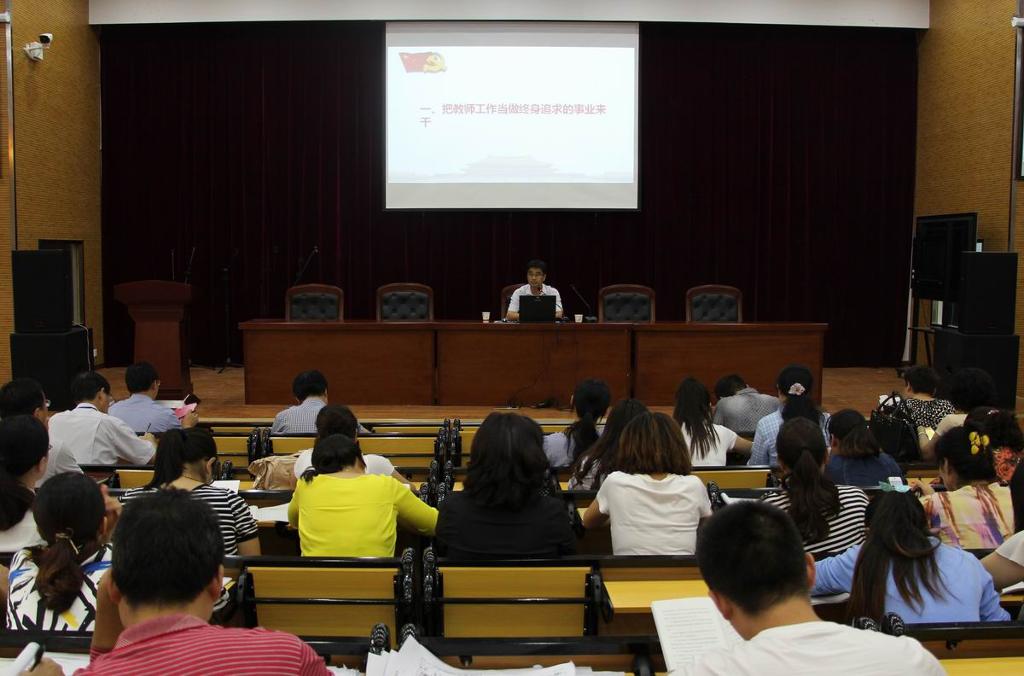 继 9 月 22 日朝阳校区党支部书记刘宗保同志为西校区初中部党员上党课后, 9 月 26 日下午,东校区党支部书记王洪军同志继续给西校区小学部党员上党课。 党课上,王洪军书记从以下几个方面 阐述了“党员在学校工作中如何发挥先锋模范作用”的问题: 终身追求,以教为业; 为师垂范,赢得学生热爱; 关爱学生,诚心真心; 发挥专业技能,使课堂优质高效; 终身读书,加强知识修养; 真诚合作,与同仁携手共进; 尊重家长,平等协作,教育共赢; 以校为家,荣辱与共,休戚相关; 创造教育业绩,提升生命价值,焕发生命光彩。 王书记结合小学教学工作实际,理论联系实际,全面而细致地阐述了党员发挥先锋模范作用的问题,深入浅出,切实明确。王书记特别强调,教育是工作,其核心在于责任;教育是事业,其意义在于献身;教育是科学,其价值在于求真;教育是艺术,其生命在于创新。只有把教育当事业来做时,我们才会有舍生忘我地投入,义无反顾地奉献,对事业孜孜追求。
