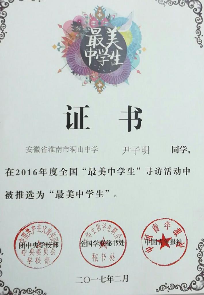 最新消息, 我校八(14)班尹子明同学被评为2016年度全国“最美中学生”。