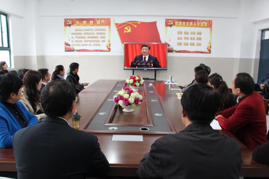 10月 18 日上午九时,我校党委组织学校所有中层及以上干部、各年级组长、党小组长、工会组长共 四十 余人在学校党员活动室实时收看中国共产党第十九次全国代表大会开幕式。回首五年,习近平同志领导全党不畏浮云遮望眼,乘风破浪扬帆远航,将中国特色社会主义理论和实践不断推向新境界。广大党员教师观看“十九大”开幕式后,倍受鼓舞,纷纷表示一定以习近平总书记重要讲话精神为指引,秉承“ 学在深处、干在实处 ” 的工作理念,不断激发工作的积极性、主动性和勇于担当的精神,努力做到观念新、思想正、人心齐,为实现我校党建工作与学校发展相互融合、共同促进而不断奋斗。