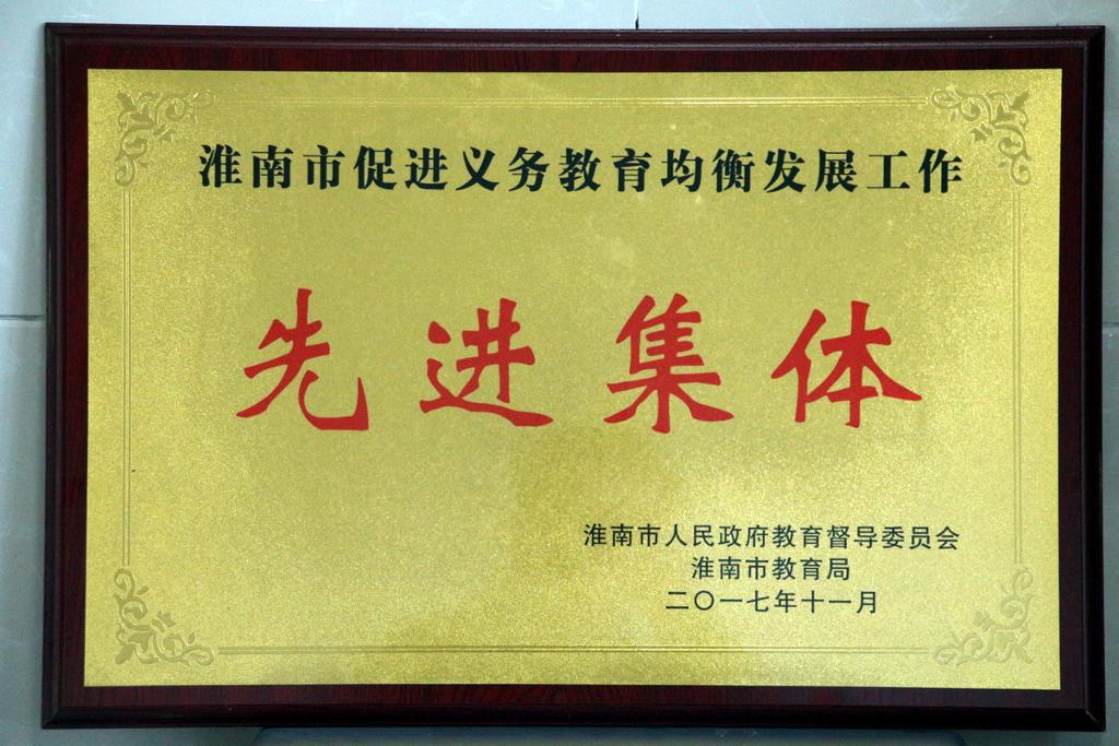 我校 根据 省市上级组织 义务教育均衡发展 的安排,长期以来,严格按照要求办学,做到配班均衡,中小学阳光分班,不设重点班,开齐学科,开足课时,开好开优课程,改善办学条件,强化教师队伍建设,促进学生德智体美全全面发展。我校义务教育均衡发展工作做得及时,做得扎实,颇有成效,赢得了良好的社会声誉,得到上级组织的肯定。为此,我校被评为 2017 年度“淮南市促进义务教育均衡发展工作先进集体”。