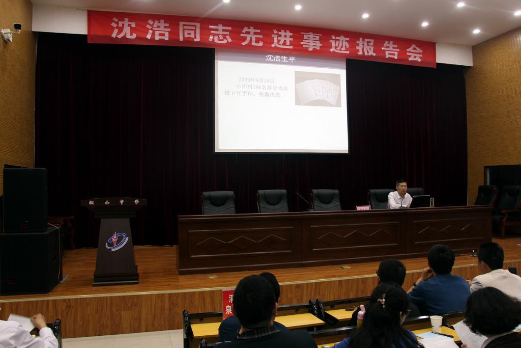 5月18日,我校邀请 滁州市行政学院副院长童子凡来校做沈浩事迹报告。校本部以及泉山湖校区、朝阳中学、淮南中学全体党员参加了报告会,聆听了报告。 沈浩同志原是安徽凤阳小岗村 党支部第一书记、村委会主任,生前为党的事业,为“三农 ”做出了重大贡献,获得全国农村基层干部“十大新闻人物”、安徽省第二批选派干部标兵、全国百名优秀村官、感动中国2009年度人物 、全国敬业奉献模范等荣誉。 沈浩病逝后,他的事迹广为流传,他的精神深深地感染着全国广大党员。 报告会上, 童 院长用大量真实的事例生动地讲述了沈浩同志生活和工作情况,事迹感人,真情动人。沈浩的事迹震撼人心,鼓励人心,四校广大党员深受教育,纷纷表示要向沈浩同志学习,忠于党,忠于人民,努力做好本职工作,为社会做贡献。