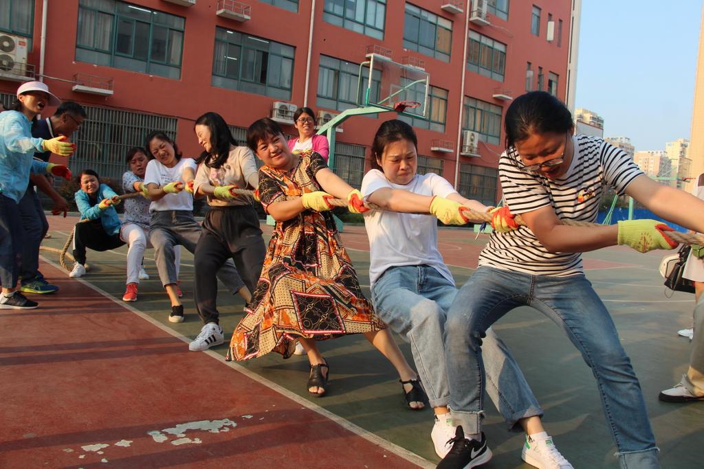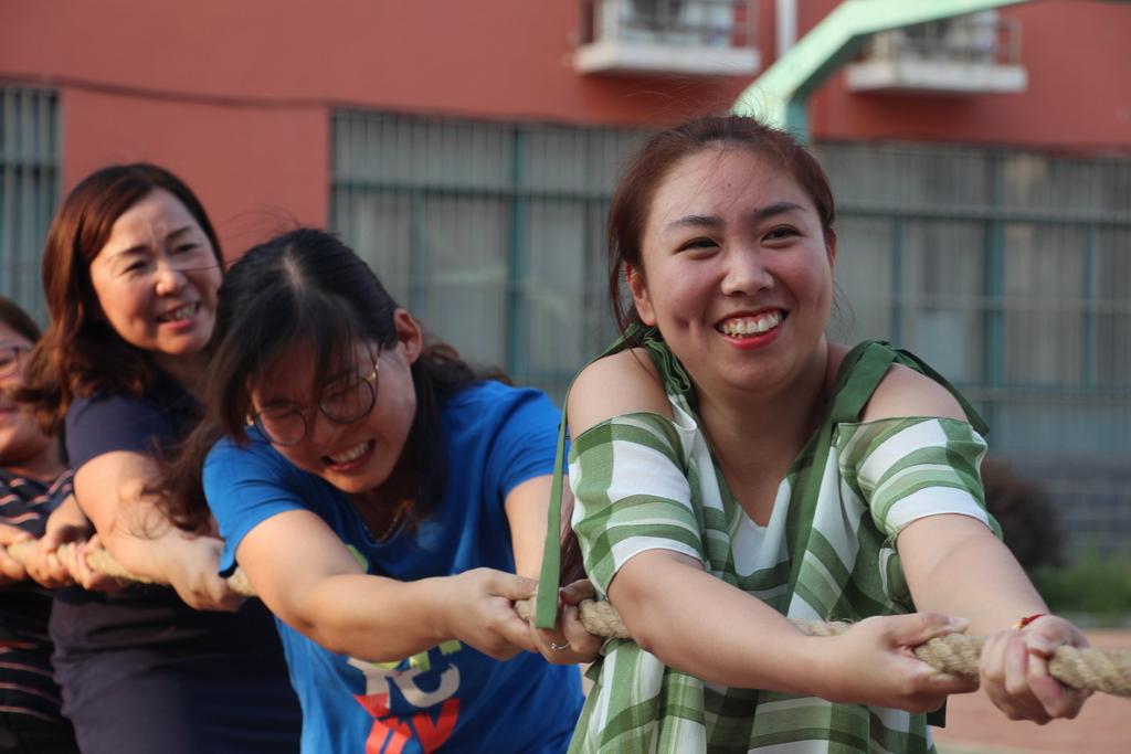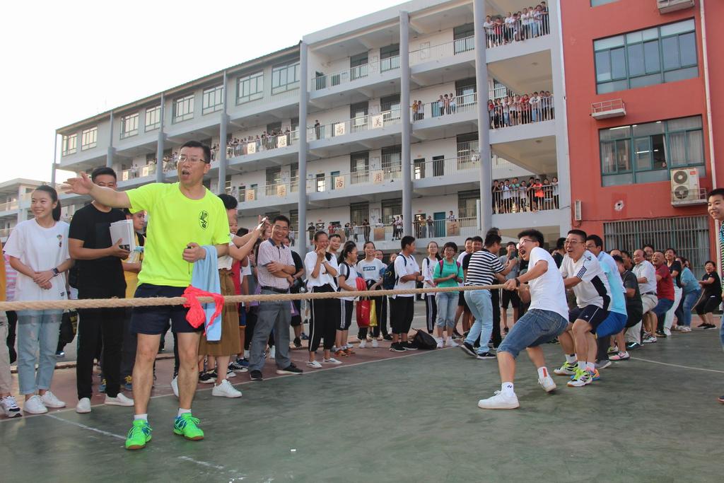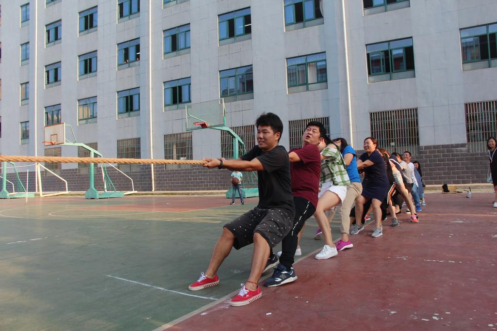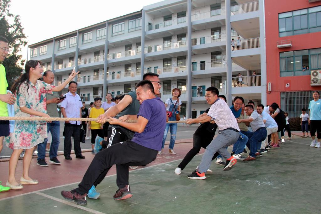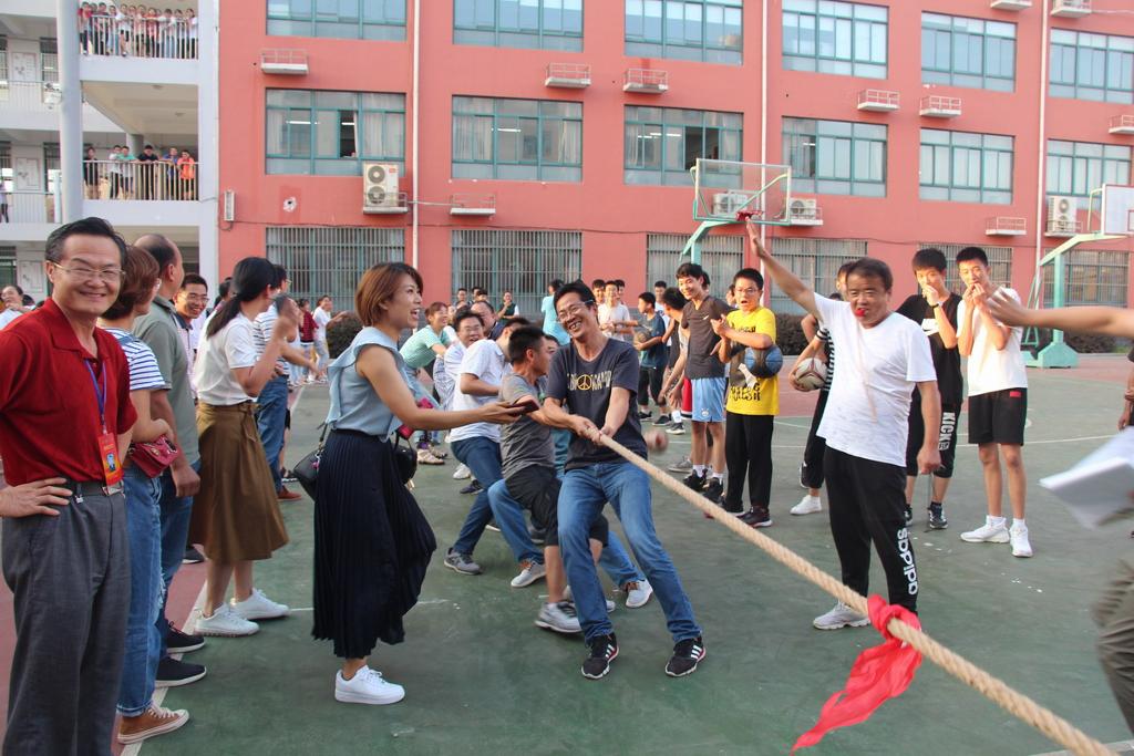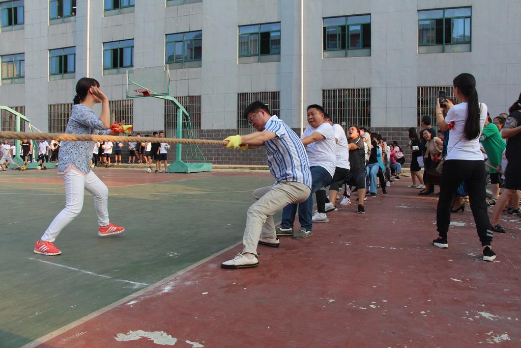 教职工 拔河比赛分两天进行,第一天为小学一四年级、二五年级、三六年级和音体美及小教处四组,第二天为七年级、八年级、九年级和行政后勤四组。比赛场上只见参赛的教职工一个个相互鼓励,脸上闪动着坚定的神情。随着哨声响起,队友们喊着“一二,一二”的口号向自己方向拼命拉绳。其他教师也自发的组成拉拉队为自己的同事加油着。赛场上欢呼声,呐喊声此起彼伏,处处洋溢着青春的滋味,赛场氛围热烈而又温馨。跳绳比赛在校体育馆进行,本次比赛采用最新中考比赛用绳,高科技的引入让比赛更公平、刺激、有序。