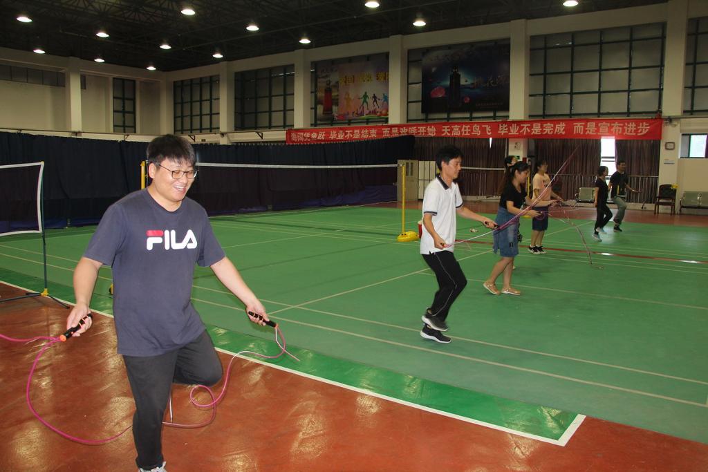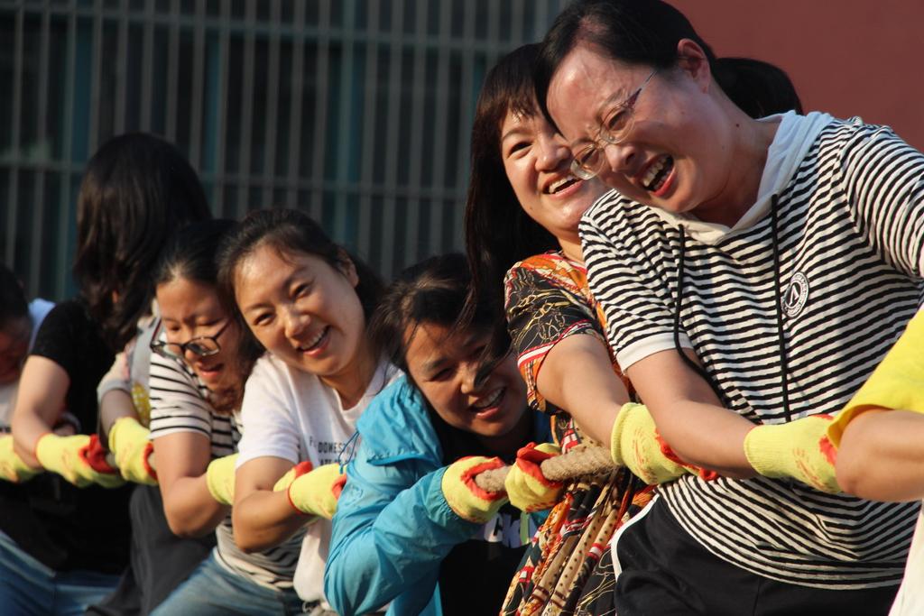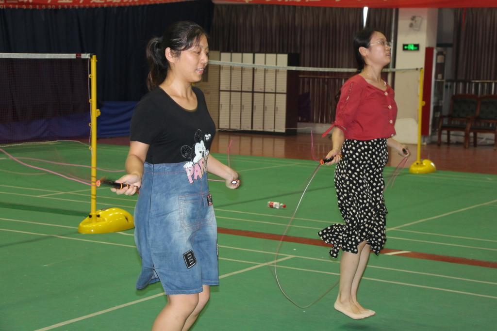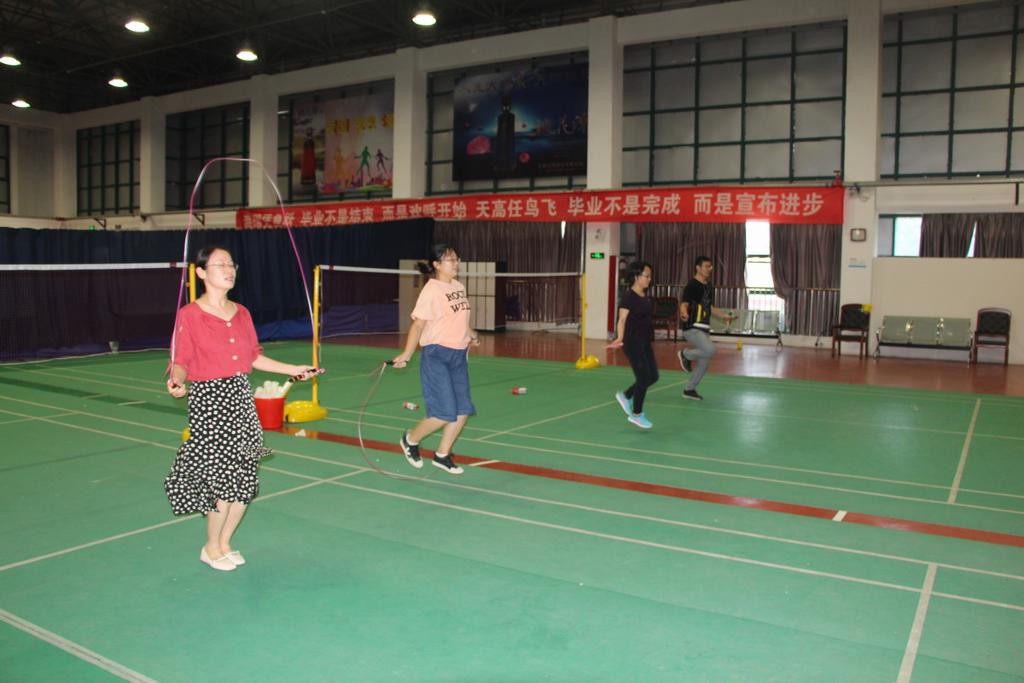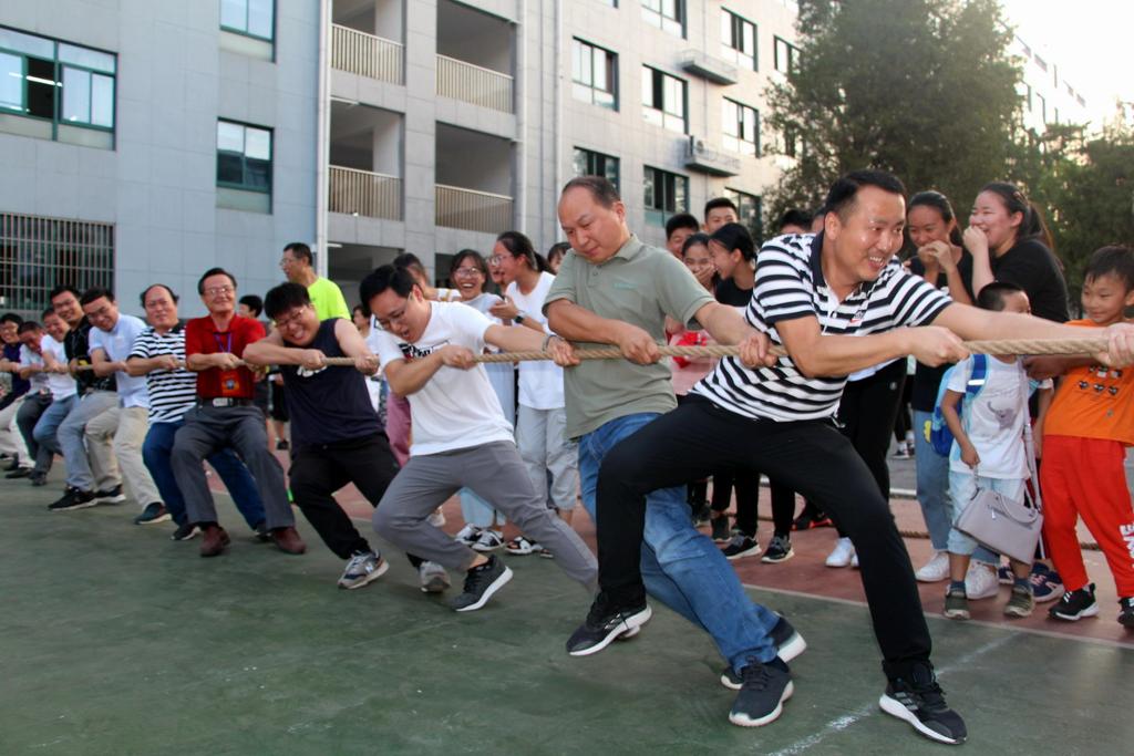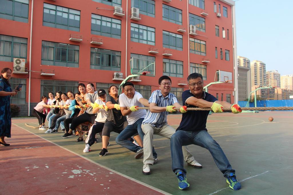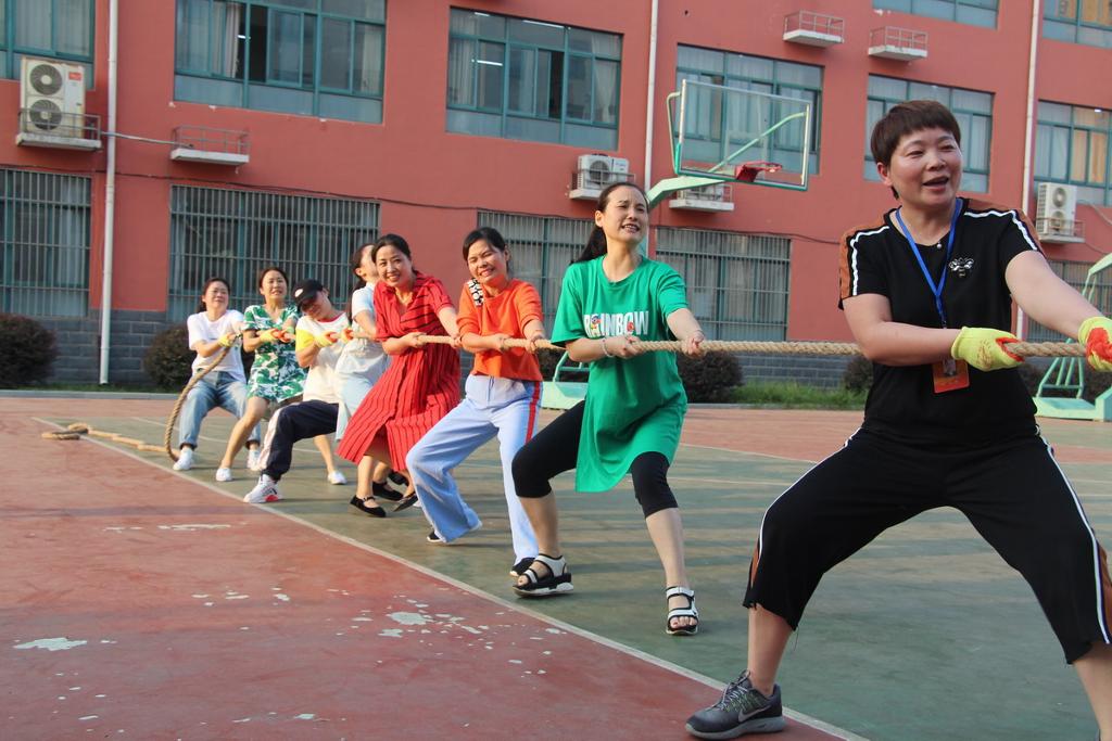 教职工 拔河比赛分两天进行,第一天为小学一四年级、二五年级、三六年级和音体美及小教处四组,第二天为七年级、八年级、九年级和行政后勤四组。比赛场上只见参赛的教职工一个个相互鼓励,脸上闪动着坚定的神情。随着哨声响起,队友们喊着“一二,一二”的口号向自己方向拼命拉绳。其他教师也自发的组成拉拉队为自己的同事加油着。赛场上欢呼声,呐喊声此起彼伏,处处洋溢着青春的滋味,赛场氛围热烈而又温馨。跳绳比赛在校体育馆进行,本次比赛采用最新中考比赛用绳,高科技的引入让比赛更公平、刺激、有序。