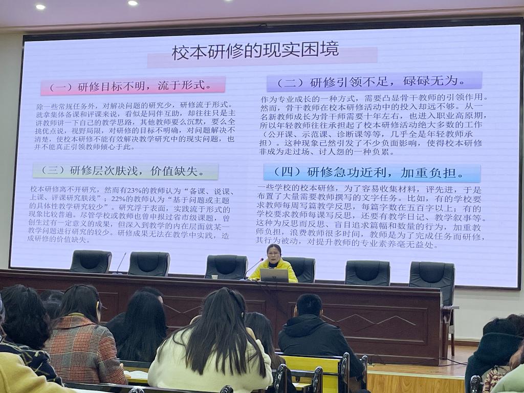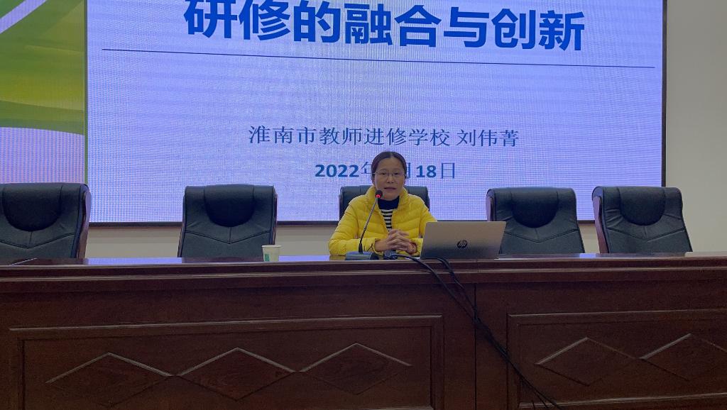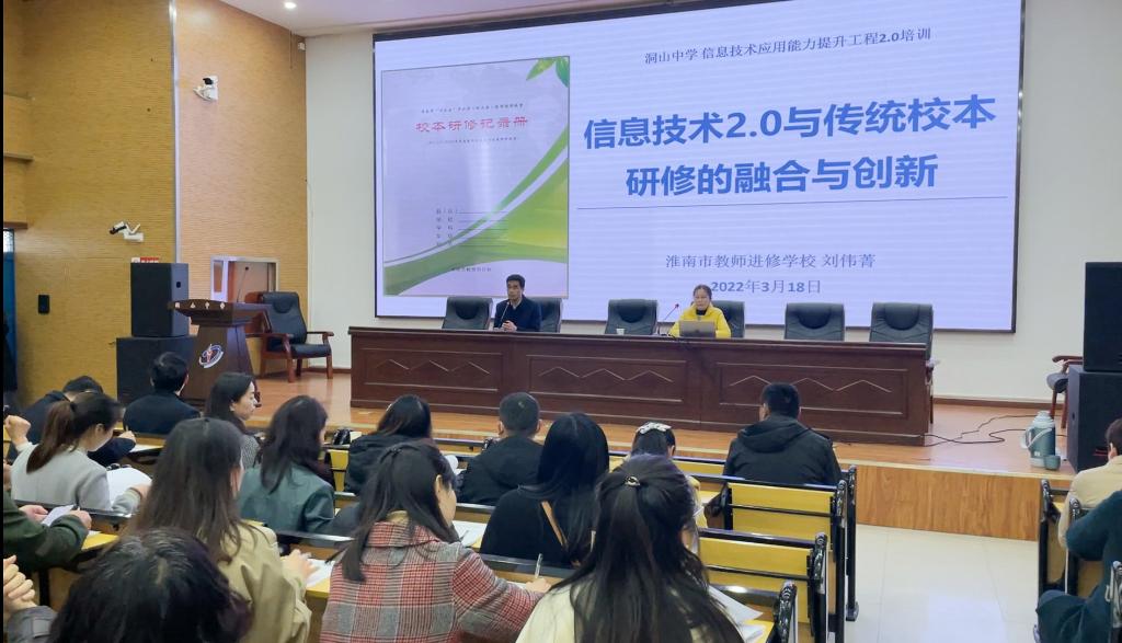 3月18日下午,我校邀请淮南市教师进修学校教研处主任刘伟菁,对全体教师进行了“信息技术2.0与传统校本研修的融合与创新”专题培训,培训由校长王洪军主持。
