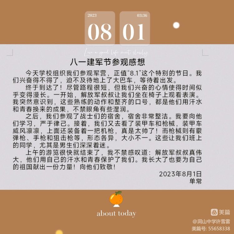 此次活动,让少先队员们感受到部队的庄严神圣,切身体会了部队官兵严谨的生活,目睹了他们精湛的本领,激发了少先队员们们对部队官兵的热爱和崇敬之情。军人严谨的纪律和艰苦训练的作风,为孩子们做出了表率。同时,也在少先队员们心中种下了一颗爱国的“种子”,坚定了立志报国的决心。