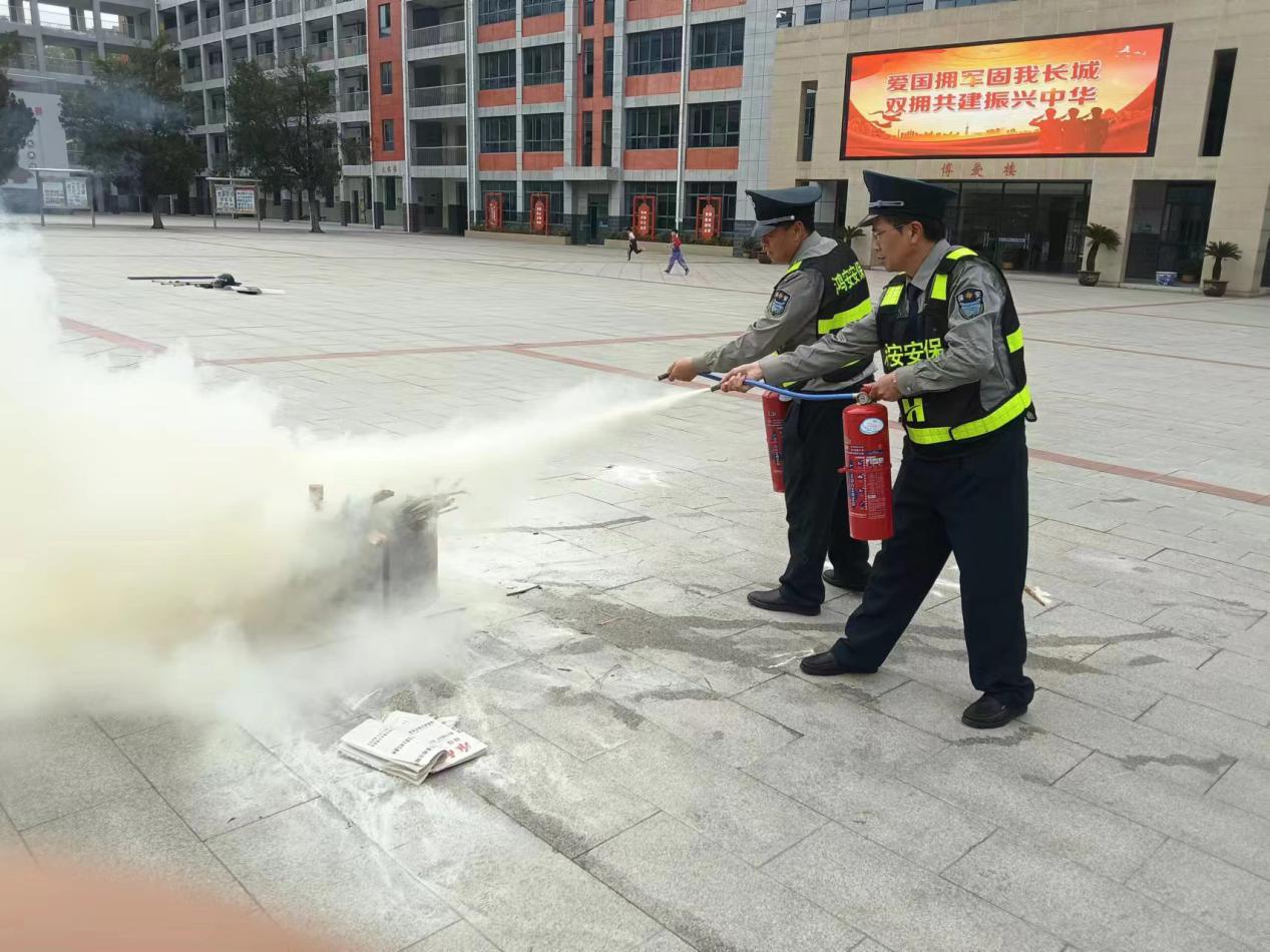 (安保人员操作灭火器模拟扑灭小型火灾)