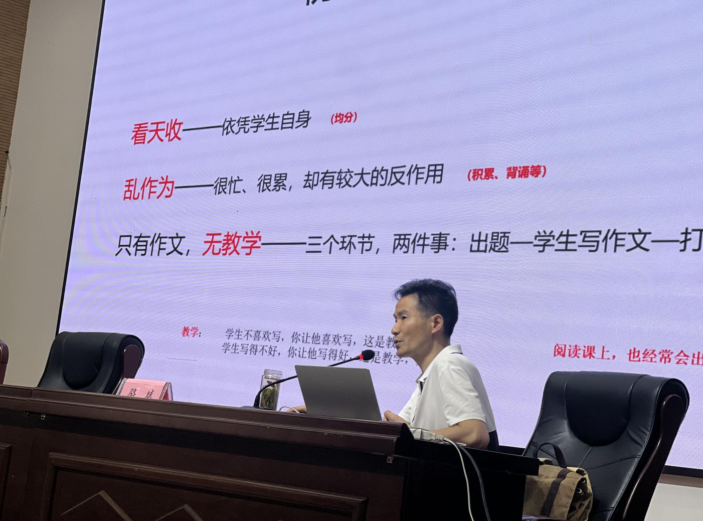 下午场由合肥市初中语文学科培训基地专家、省义务教育质量监测学科专家组成员、省初中语文学科教育指导专家组成员,省命题专家骆斌老师为大家带来主题为《作文教学上的突围》的报告讲座。骆老师从自身教学角度出发一点一滴破解作文教学上的重难点,教会老师要勇于尝试。