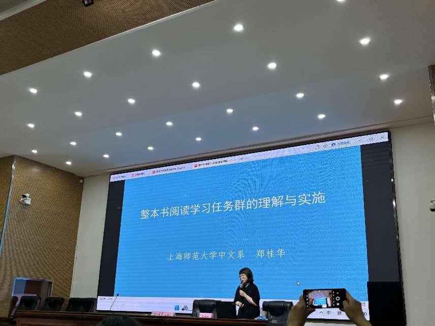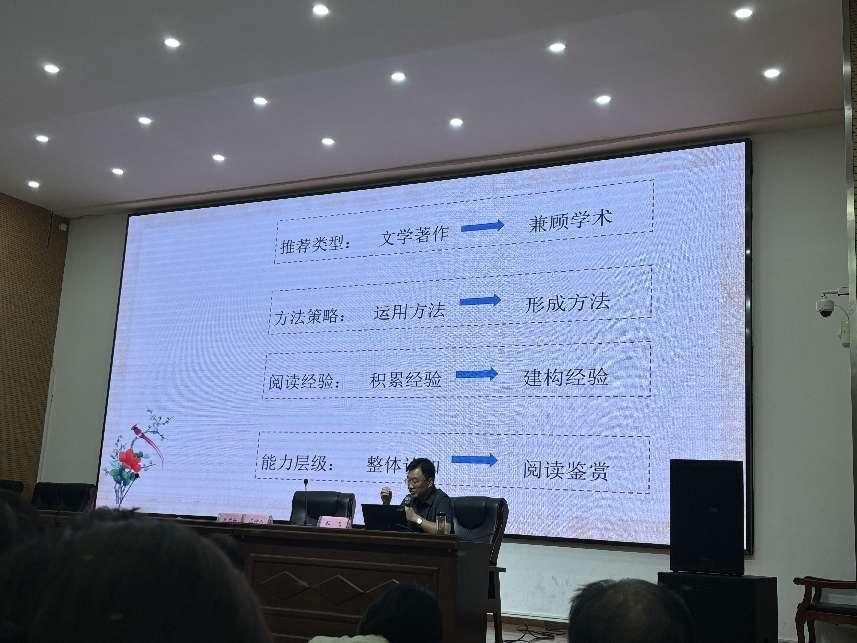 接着,马鞍山市教研室的杜飞主任进行了关于《摭谈基于思维提升的整本书阅读与研讨》的讲座。讲座中,杜主任引经据典,从时代要求、课标定位、课型选择等角度,用一个个教学实例为老师们打开整本书阅读教学思路的大门,令老师们回味无穷。