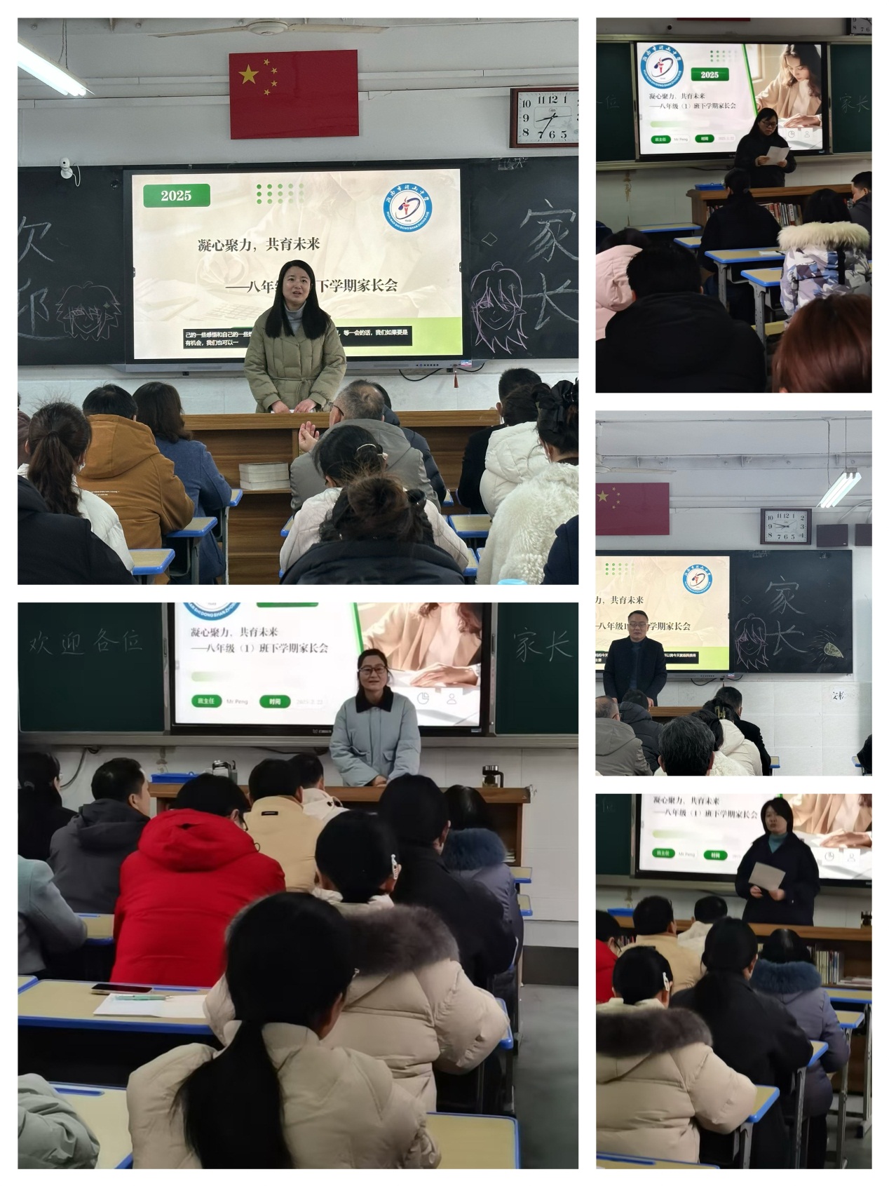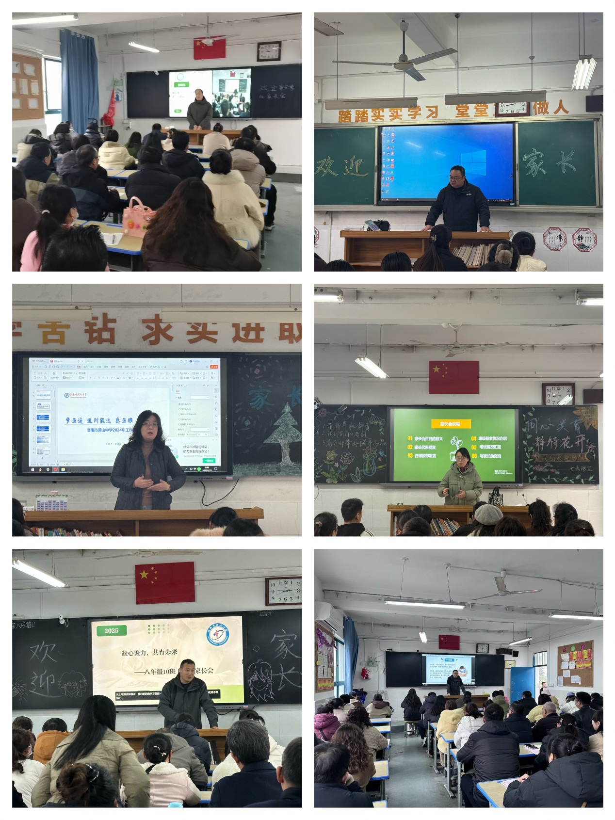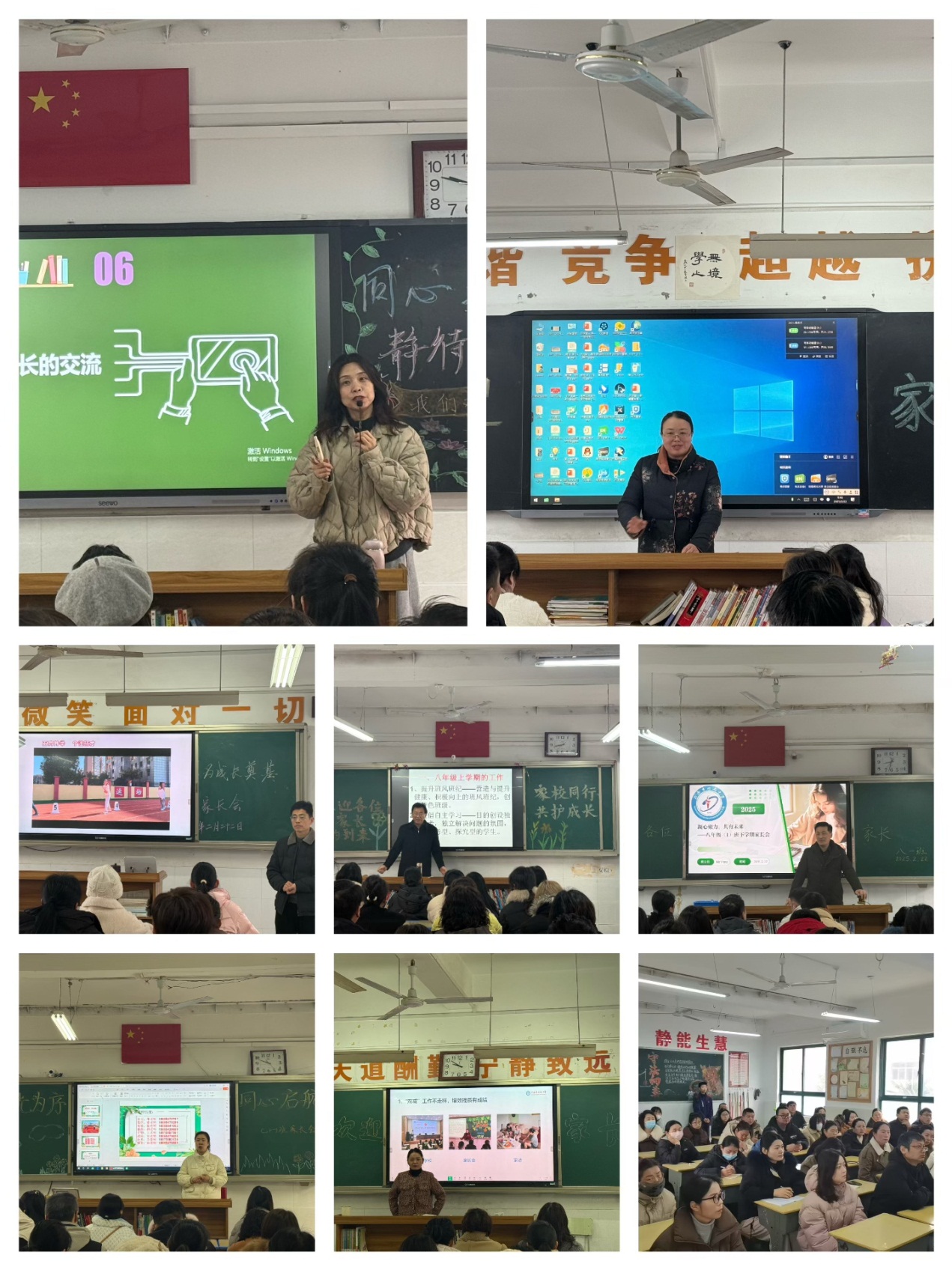 七八年级各班班主任分别向家长们汇报了班级整体情况地同时,也从学生的学习态度、行为习惯、课堂表现等方面进行了详细分析,并结合期中期末考试的情况,指出了学生的优点和需要改进的地方。同时,班主任还向家长们提出了具体的建议,例如如何帮助学生合理安排学习时间、培养良好的学习习惯等。尤其提醒家长,初中阶段的孩子心理和生理都在发生着巨大变化,要注意孩子的交友、课外阅读以及手机使用等现实问题。